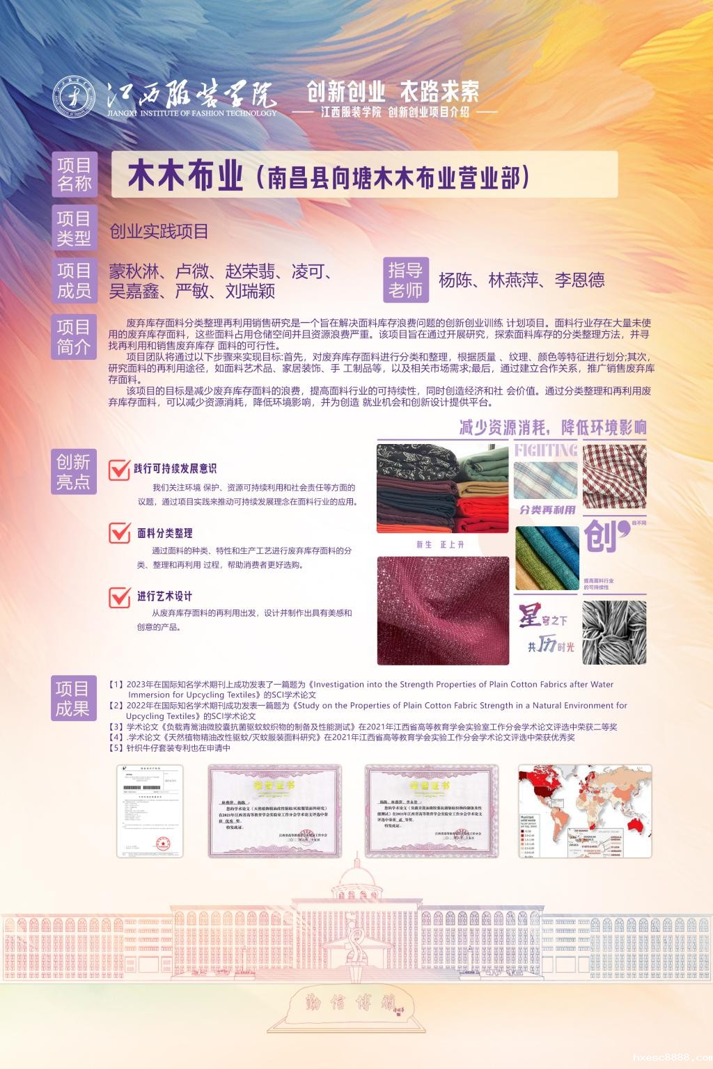 项目简介:废弃库存面料分类整理再利用销售研究是一个旨在解决面料库存浪费问题的创新创业训练 计划项目。面料行业存在大量未使用的废弃库存面料,这些面料占用仓储空间并且资源浪费严重。该项目旨在通过开展研究,探索面料库存的分类整理方法,并寻找再利用和销售废弃库存 面料的可行性。